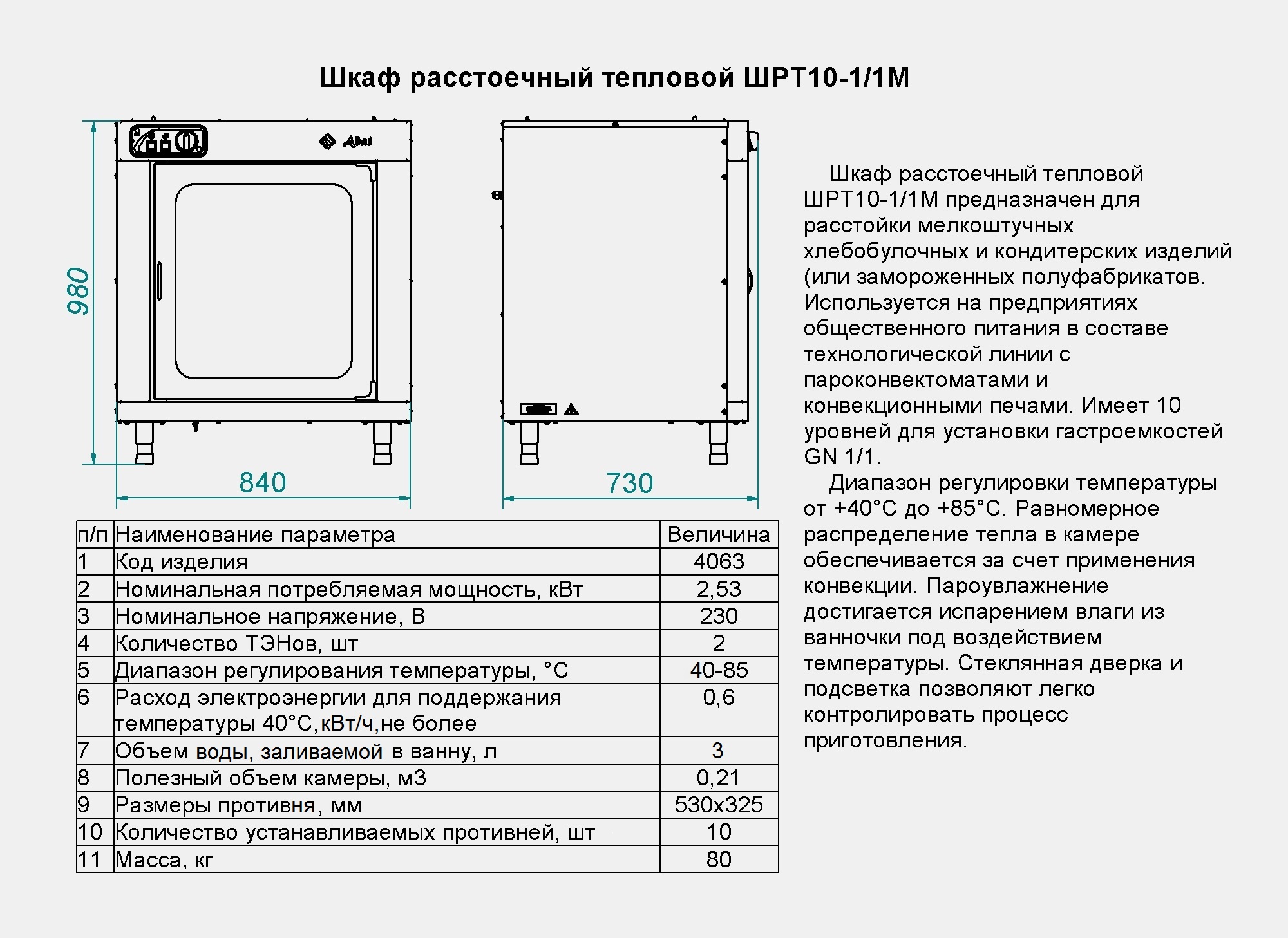Расстоечный шкаф Abat ШРТ 10-1/1М2 используется в пекарнях, кондитерских и на предприятиях общественного питания и торговли для расстойки тестовых заготовок, в процессе которой тесто увеличивается в объеме и приобретает ровную поверхность, восстанавливается его пористость. Модель оснащена регулируемыми по высоте ножками.