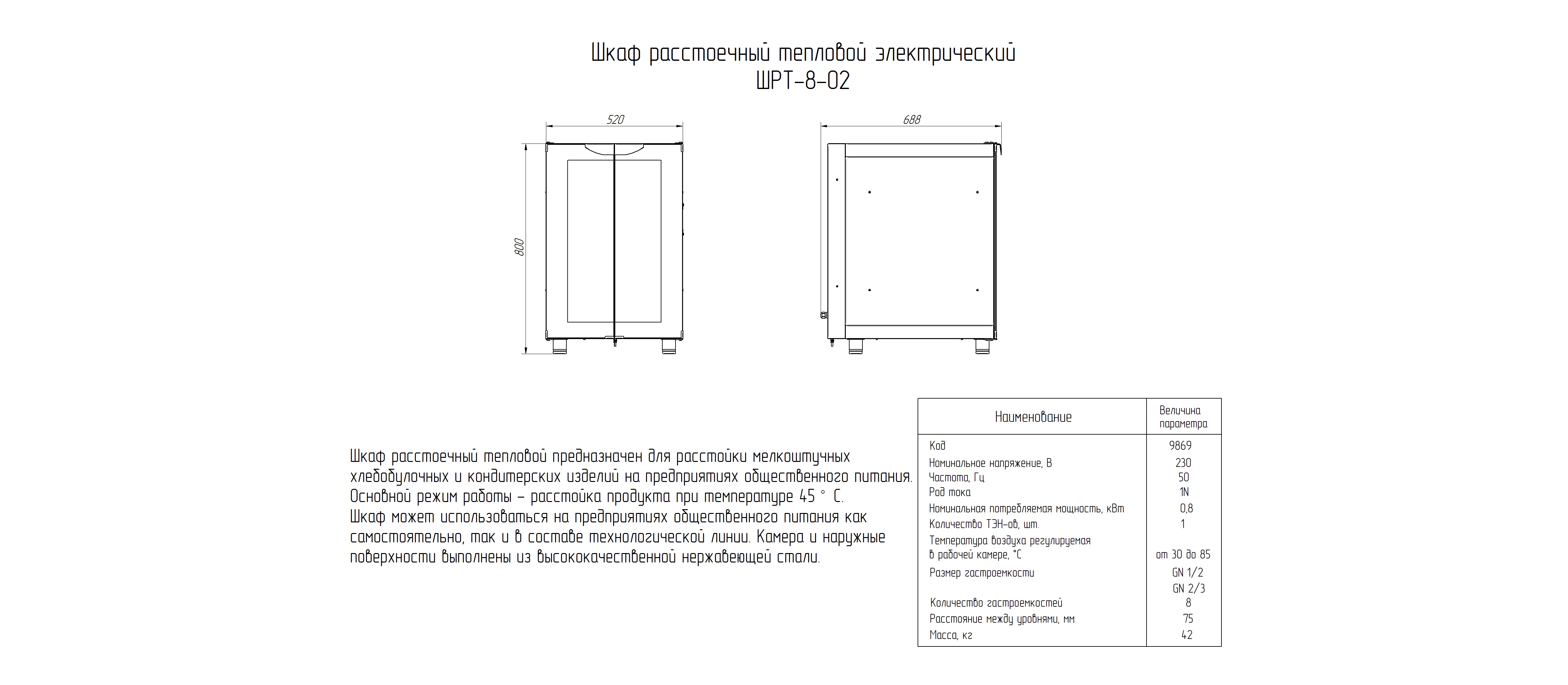 Расстоечный шкаф Abat ШРТ-8-02 используется в пекарнях, кондитерских и на предприятиях общественного питания и торговли для расстойки тестовых заготовок, в процессе которой тесто увеличивается в объеме и приобретает ровную поверхность, восстанавливается его пористость. Модель оснащена лотком для сбора конденсата и регулируемыми по высоте ножками.
